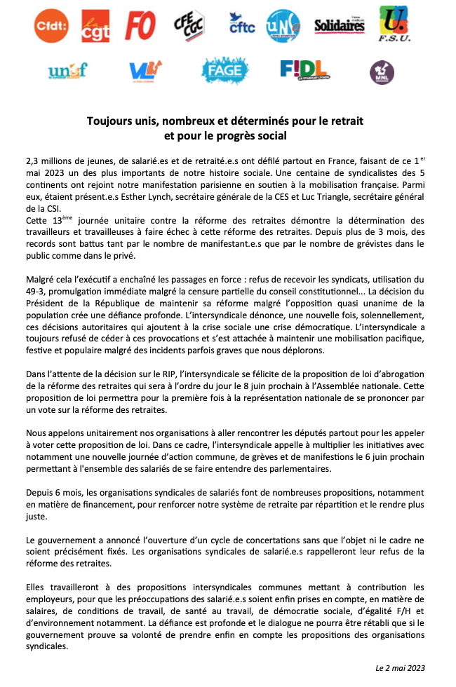 Toujours unis, nombreux et déterminés pour le retrait et pour le progrès social !Par Snepl-CFTC / 9 mai 2023 FacebookShare on XLinkedInWhatsAppEmailCopy LinkPrint