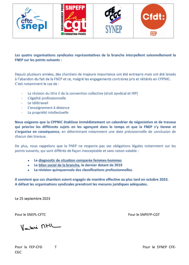 URGENT : les organisations syndicales représentatives de la branche interpellent solennellement la FNEP !Par Snepl-CFTC / 4 octobre 2023 FacebookShare on XLinkedInWhatsAppEmailCopy LinkPrint