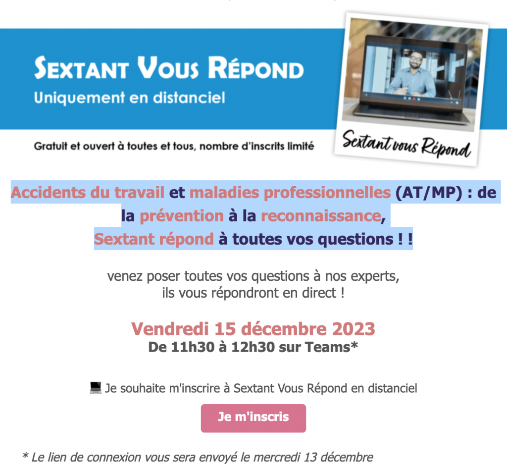 Vendredi 15 décembre 2023 : Accidents du travail et maladies professionnelles (AT/MP) : de la prévention à la reconnaissance, Sextant répond à toutes vos questions ! !Par Snepl-CFTC / 30 novembre 2023 Inscrivez-vous vite à l’évènement Sextant ! Lien pour vous inscrire : https://archives.express-mailing.com/4/3503/1860938/index.htm FacebookShare on XLinkedInWhatsAppEmailCopy LinkPrint