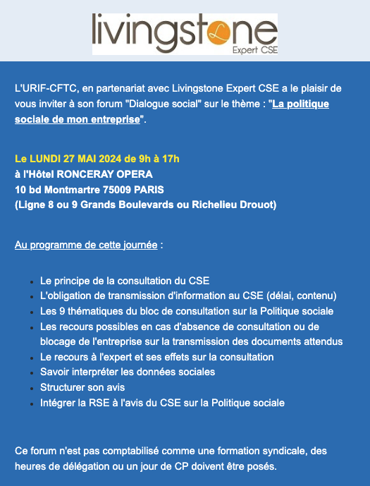 Lundi 27 mai 2024 : forum « dialogue social » sur le thème : « La politique sociale de mon entreprise ».Par Snepl-CFTC / 19 mars 2024 FacebookShare on XLinkedInWhatsAppEmailCopy LinkPrint