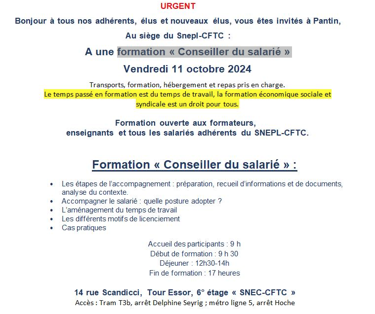 Vendredi 11 octobre 2024 : inscrivez-vous à la formation « conseiller du salarié » !Par Snepl-CFTC / 4 septembre 2024 Venez vous former, échanger, partager vos expériences, changer d’air. Remplissez le formulaire d’inscription ( à télécharger ici – format word ) et prévenez votre employeur avant le 11 septembre 2024. ( lettre à télécharger ici – format word) FacebookShare on XLinkedInWhatsAppEmailCopy LinkPrint