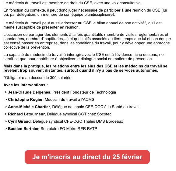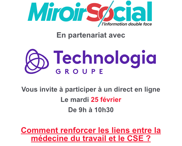 Mardi 25 février : webinaire sur le thème : comment renforcer les liens entre la médecine du travail et le CSE ?Par Snepl-CFTC / 12 février 2025 FacebookShare on XLinkedInWhatsAppEmailCopy LinkPrint