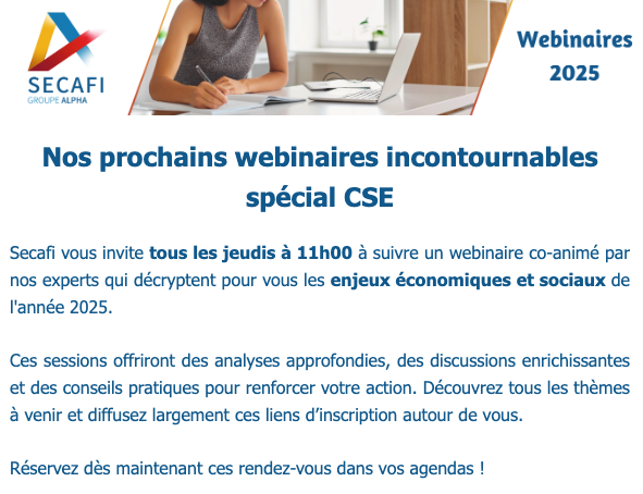 Avril à juin 2025 : découvrez le programme des prochains webinaires incontournables spécial CSE !Par Snepl-CFTC / 9 avril 2025 TÉLÉCHARGEZ LA LISTE DES WEBINAIRES (pdf) ET INSCRIVEZ-VOUS VITE ! FacebookShare on XLinkedInWhatsAppEmailCopy LinkPrint