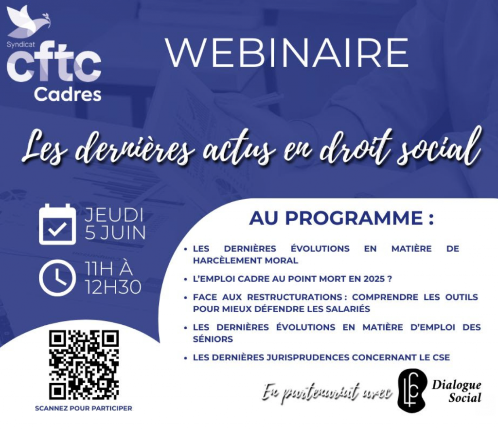 Jeudi 5 juin 2025 : webinaire sur les dernières actualités en droit social !Par Snepl-CFTC / 21 mai 2025 FacebookShare on XLinkedInWhatsAppEmailCopy LinkPrint