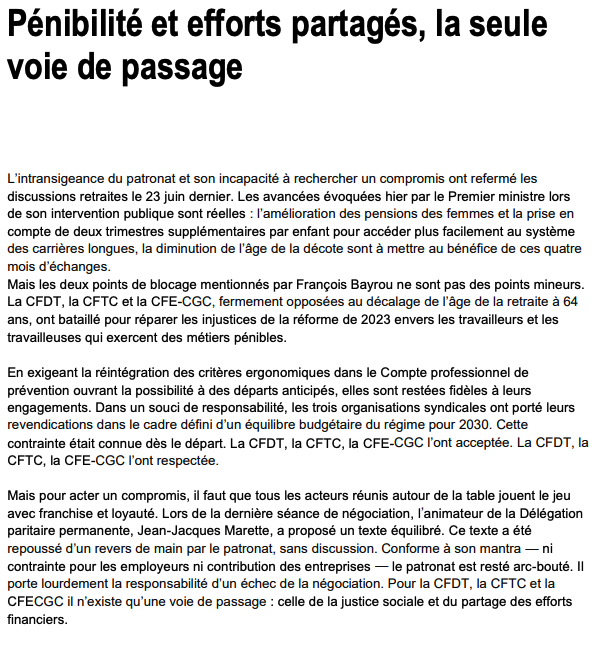 Retraites : pénibilité et efforts partagés, la seule voie de passage !Par Snepl-CFTC / 1 juillet 2025 FacebookShare on XLinkedInWhatsAppEmailCopy LinkPrint