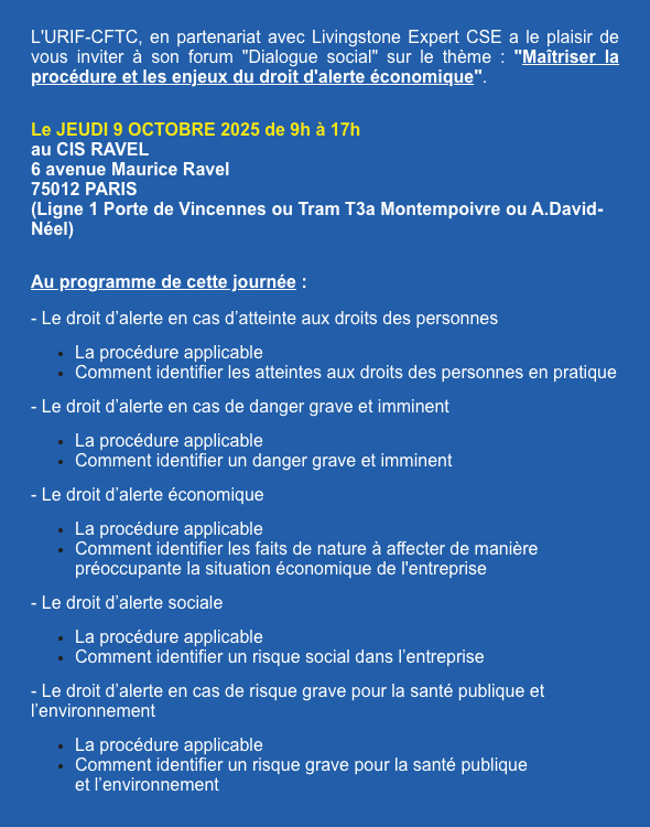 9 octobre 2025 : forum URIF-CFTC : « Maîtriser la procédure et les enjeux du droit d’alerte économique ».Par Snepl-CFTC / 2 septembre 2025 FacebookShare on XLinkedInWhatsAppEmailCopy LinkPrint