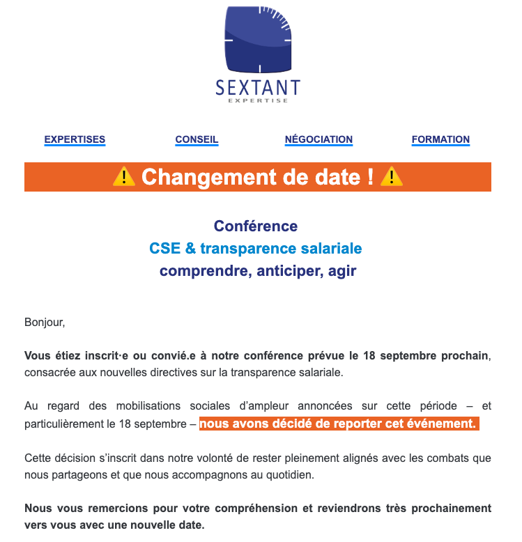 ⚠️ Changement de date ! ⚠️ Conférence CSE & transparence salariale : comprendre, anticiper, agir !Par Snepl-CFTC / 4 septembre 2025 FacebookShare on XLinkedInWhatsAppEmailCopy LinkPrint