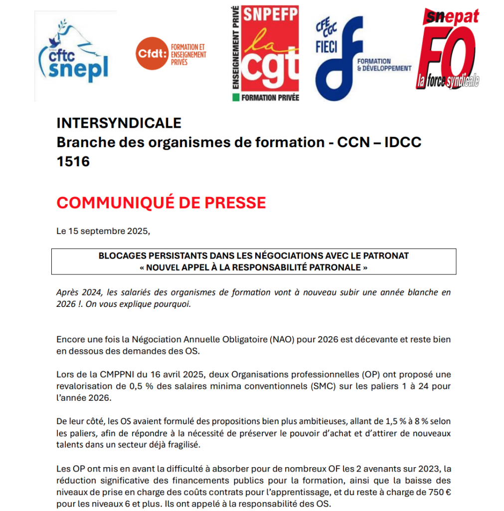 15-09-25 : BLOCAGES PERSISTANTS DANS LES NÉGOCIATIONS AVEC LE PATRONAT « À NOUVEAU UN APPEL À LA RESPONSABILITÉ PATRONALE » !Par Snepl-CFTC / 17 septembre 2025 FacebookShare on XLinkedInWhatsAppEmailCopy LinkPrint