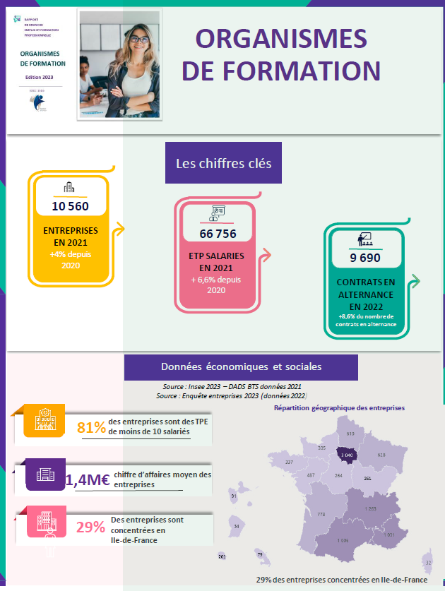 - Plus de 8 000 organismes de formation de plus de 2 salariés (organismes privés à but lucratif ou non lucratif, SA, SARL, SAS, SCOP, Association…) ayant pour activité principale la formation.